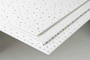 White and acoustic, acoustic-designed perforated gypsum plasterboards are optionally produced with edge border or full perforation. Edge border plates can be produced as edge chamfered plates. Glass wool is applied as standard to increase the acoustic property on the back surfaces of the perforation gypsum boards.
